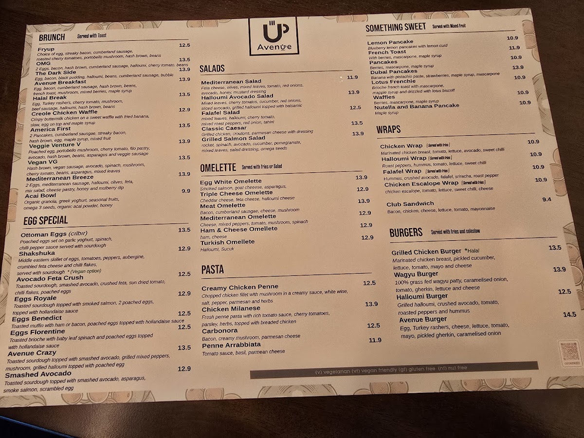 The menu at Cafe Avenue Bethnal Green offers a wide range of comforting and flavorful dishes that cater to all tastes. For brunch, you can enjoy classics like the Avenue Breakfast or indulge in something unique like the Halal Break. If you have a sweet tooth, the Lemon Pancake and Lotus Frenchie are must-tries. Their selection of salads, such as the Mediterranean Salad and Grilled Salmon Salad, are fresh and satisfying, while the wraps, like the Chicken Wrap and Falafel Wrap, are perfect for a light yet filling meal. For egg lovers, dishes like Shakshuka and Eggs Royale stand out, alongside hearty omelette options such as the Triple Cheese Omelette and Mediterranean Omelette. Burger enthusiasts will appreciate the Wagyu Burger and Avenue Burger, and pasta lovers can savor the Creamy Chicken Penne or Penne Arrabbiata. Extras like Streaky Bacon or Smoked Salmon can elevate any dish, and for kids, the Little Breakfast and Chicken Nuggets are great choices. To complement your meal, the café offers a variety of coffee options, from Espresso to Latte, as well as refreshing smoothies like the Merry Berry and Goji Island. Whether you're stopping by for a quick bite or a leisurely meal, Cafe Avenue provides a satisfying menu for every craving.
